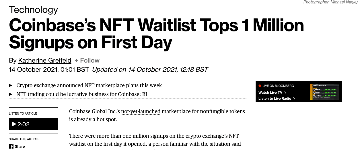 Probably nothing right?…. https://www.bloomberg.com/news/articles/2021-10-14/coinbase-s-nft-waitlist-tops-one-million-signups-on-first-day